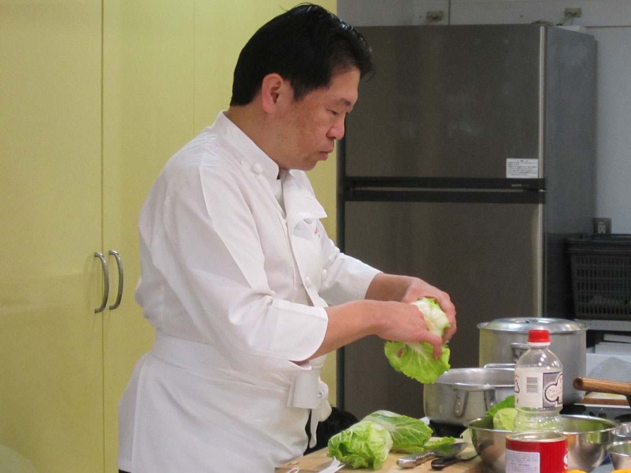 3. 白菜の葉を千切りにして(2)のボールにいれてオリーブオイル入れて軽くまぜる。